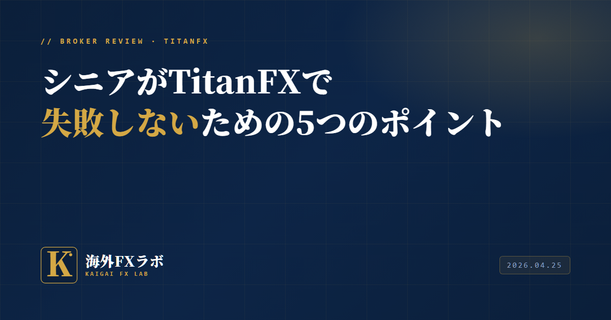 海外FXは若い世代だけのものではありません。むしろシニア層だからこそ、冷静な判断と計画的な取引が可能です。ただし、「シニア=安全」というわけではなく、注意すべき点があります。私が10年以上の実口座運用を通じて見てきた、シニア投資家が陥りやすい失敗パターンをもとに、TitanFXで確実に成功するための5つのポイントをお伝えします。